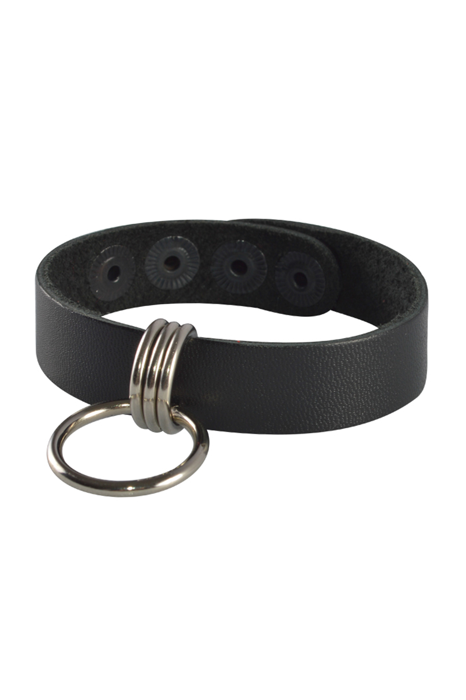 Браслет из натуральной кожи черного цвета, украшен подвесным металлическим кольцом. Регулируется при помощи кнопок. Длина браслета 21 см, ширина 1,5 см. Металлическое кольцо имеет никелевое покрытие.